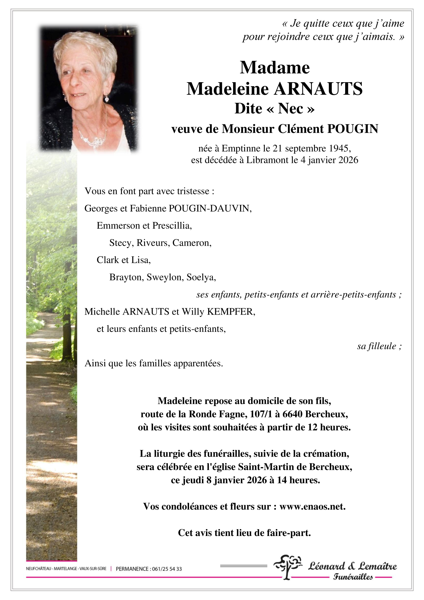 Fallecida en Libramont-Chevigny (6800, Bélgica) el domingo, 4 de enero de 2026 a la edad de 80 años