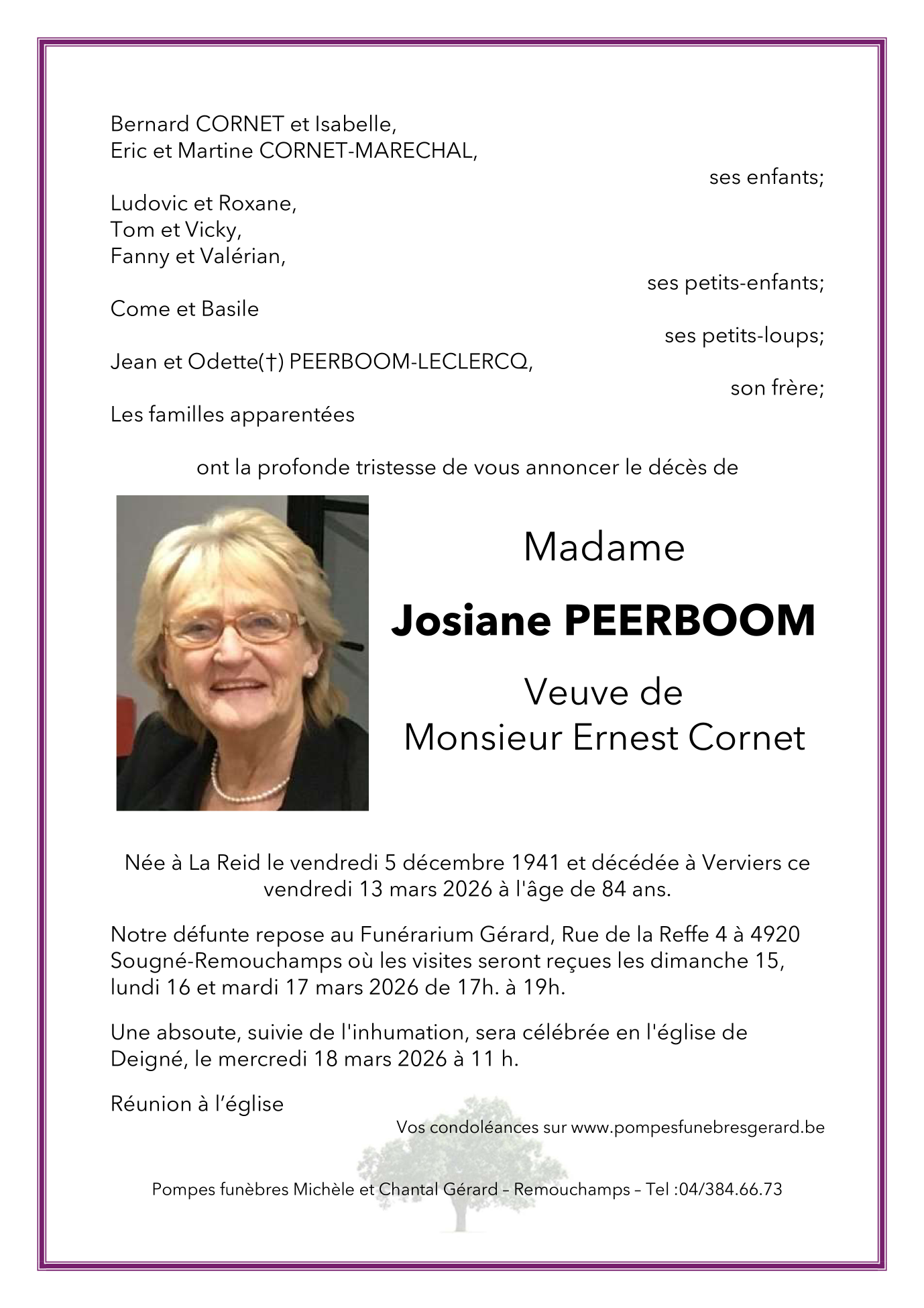Décédée à Verviers (4800, Belgique) le vendredi 13 mars 2026 à l'âge de 84 ans