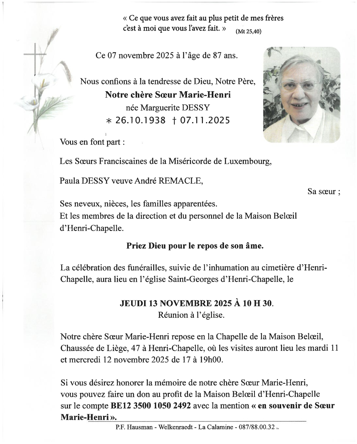 Died in Henri-Chapelle (4841, Belgium) on 07 November 2025 at the age of 87 years