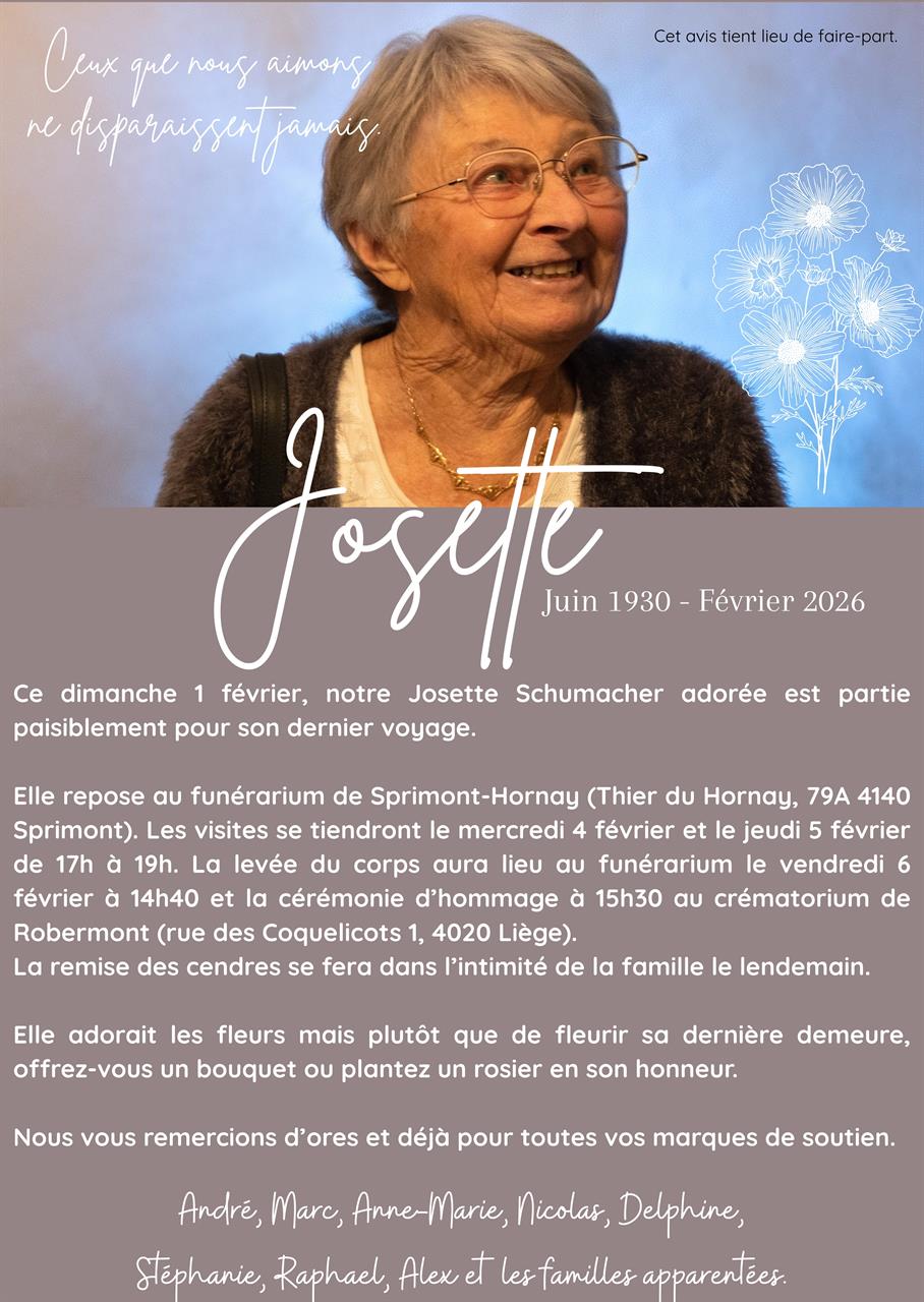 Overleden te Liège (4000, België) op zondag 1 februari 2026 op 95-jarige leeftijd