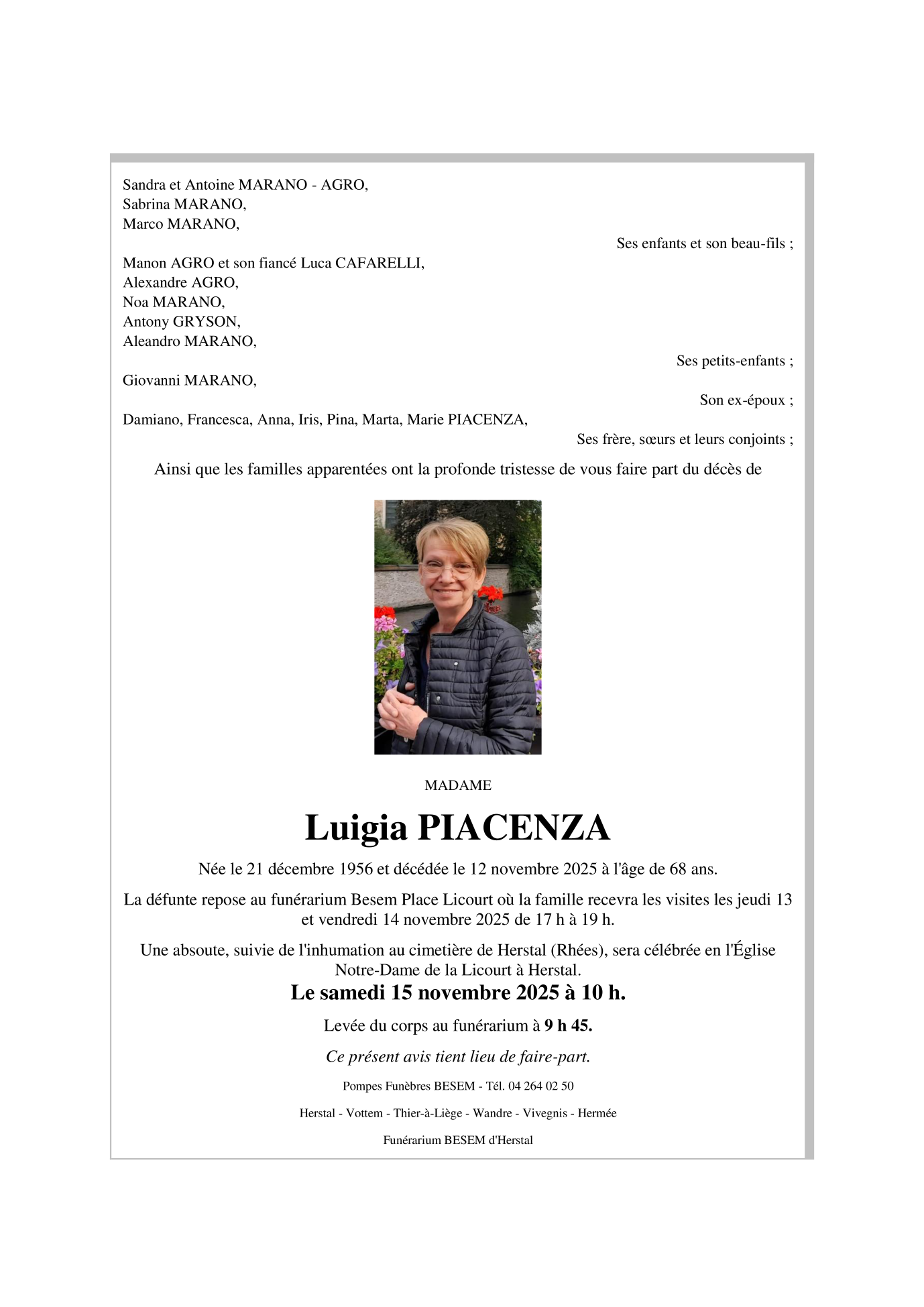 Décédée à Liège (4000, Belgique) le mercredi 12 novembre 2025 à l'âge de 68 ans