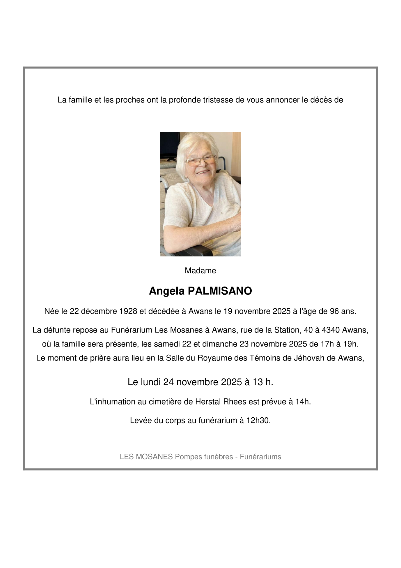 Fallecida en Awans (4340, Bélgica) el miércoles, 19 de noviembre de 2025 a la edad de 96 años