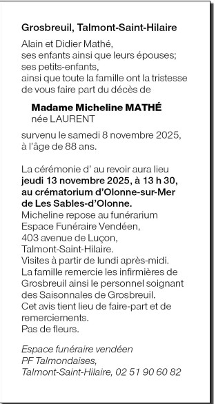 Overleden te Grosbreuil (85440, Frankrijk) op zaterdag 8 november 2025 op 88-jarige leeftijd
