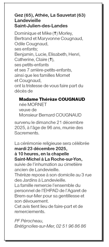 Fallecida en Brem-sur-Mer (85470, Francia) el domingo, 21 de diciembre de 2025 a la edad de 96 años