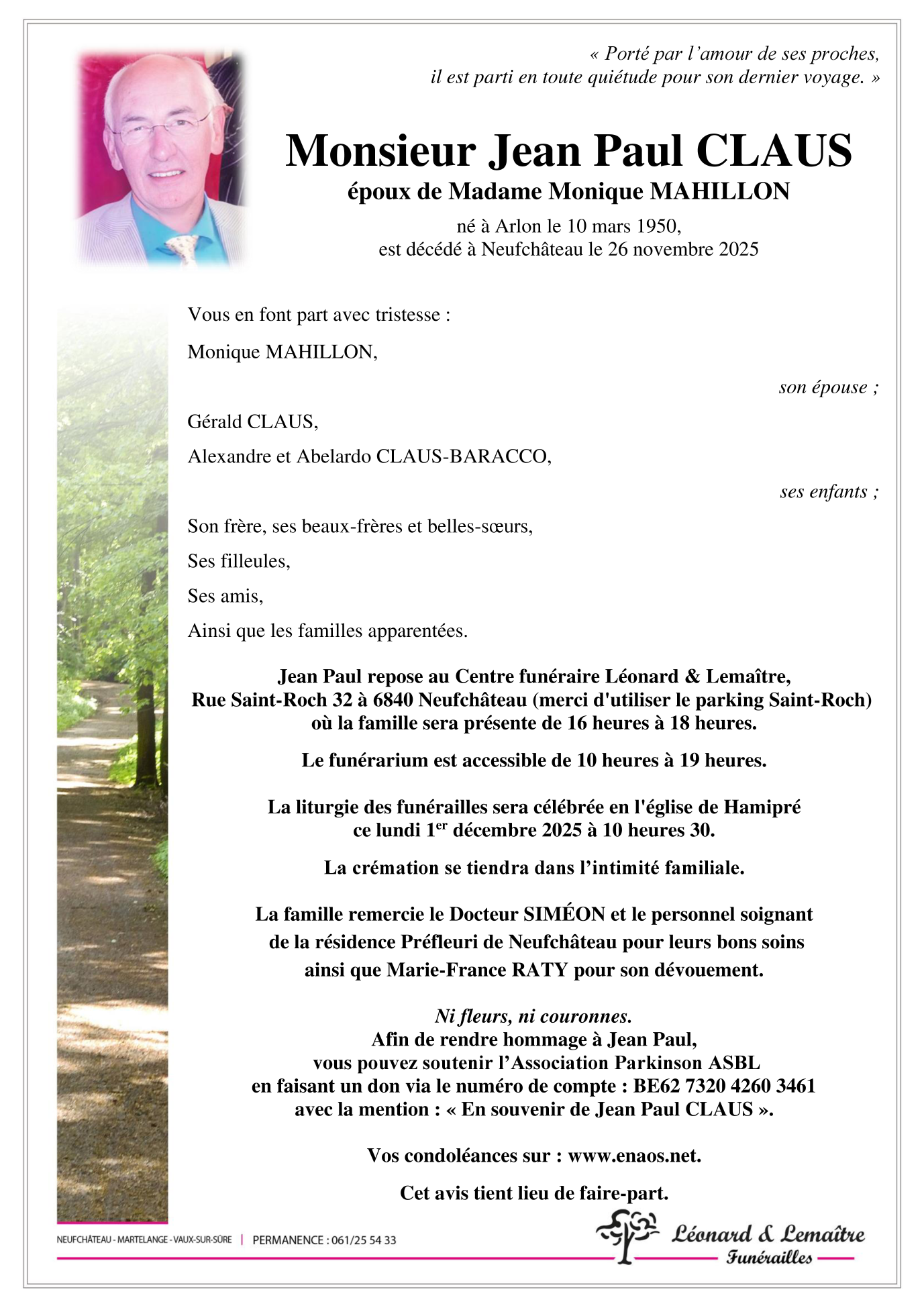 Décédé à Neufchâteau (6840, Belgique) le mercredi 26 novembre 2025 à l'âge de 75 ans