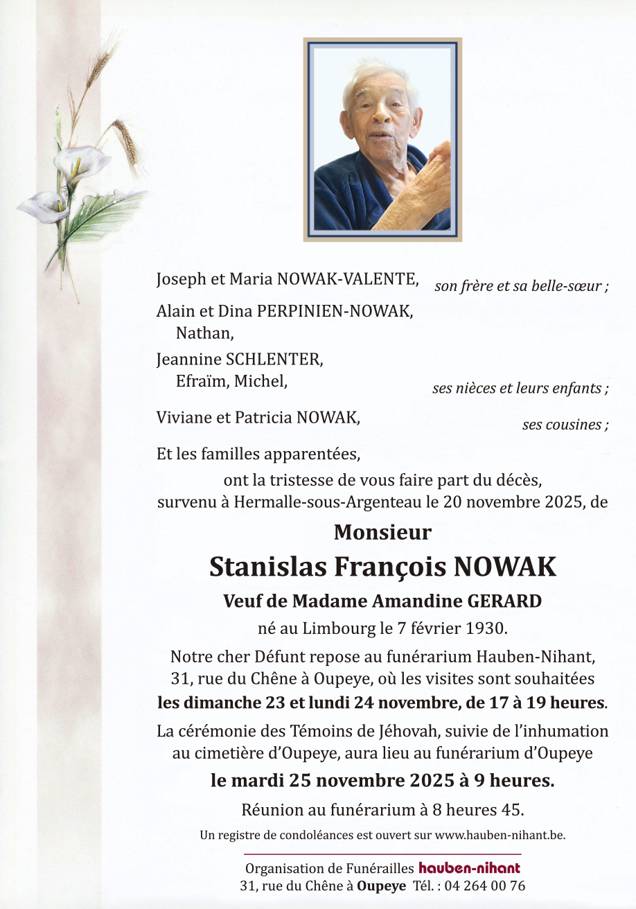 Décédé à Hermalle-sous-Argenteau (4681, Belgique) le jeudi 20 novembre 2025 à l'âge de 95 ans
