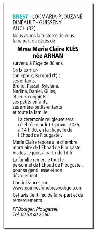 Fallecida en Plougastel-Daoulas (29470, Francia) el jueves, 8 de enero de 2026 a la edad de 88 años