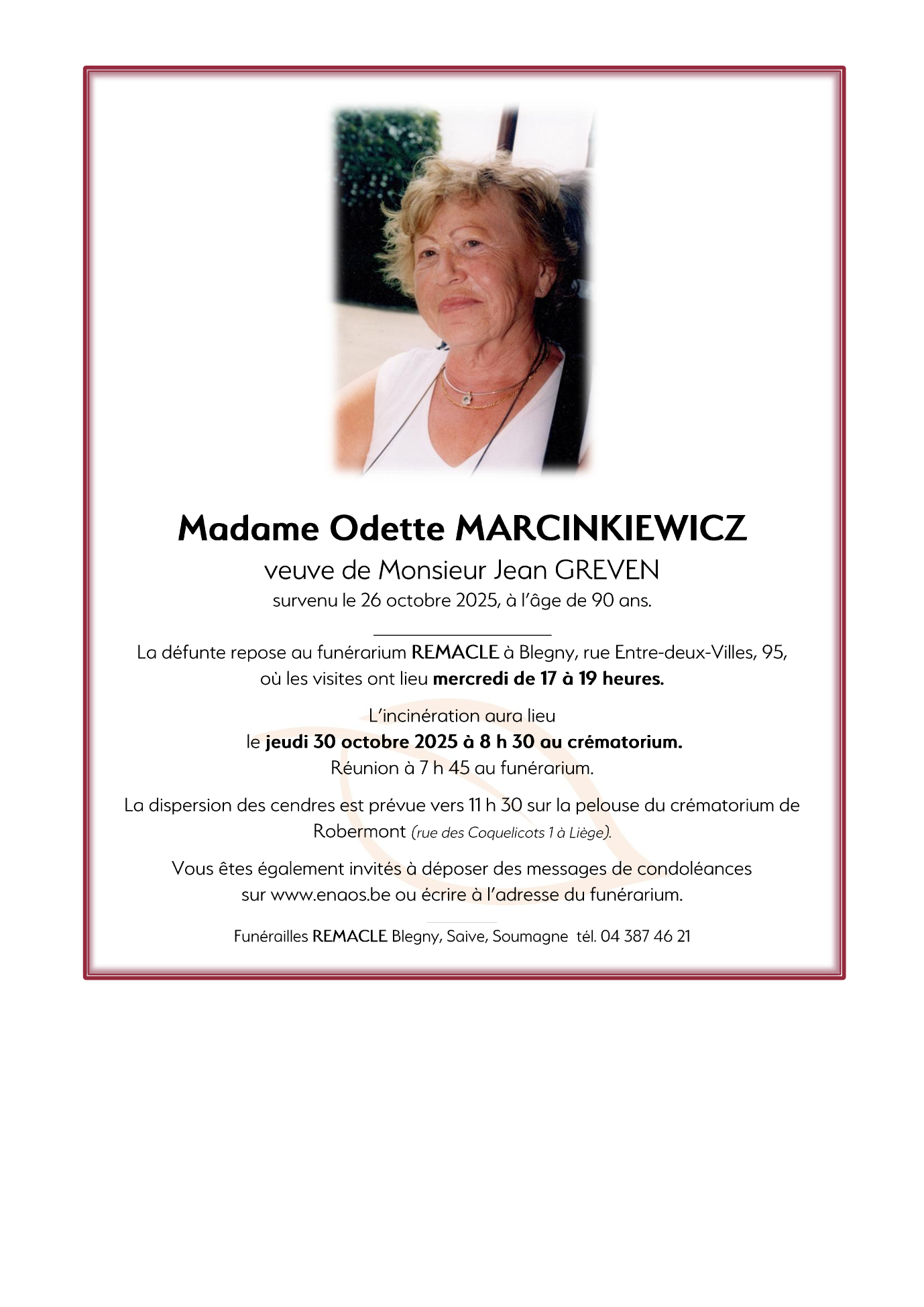 Fallecida en Blegny (4670, Bélgica) el domingo, 26 de octubre de 2025 a la edad de 90 años