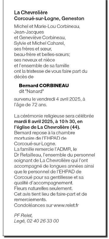 Overleden te Corcoué-sur-Logne (44650, Frankrijk) op vrijdag 4 april 2025 op 72-jarige leeftijd