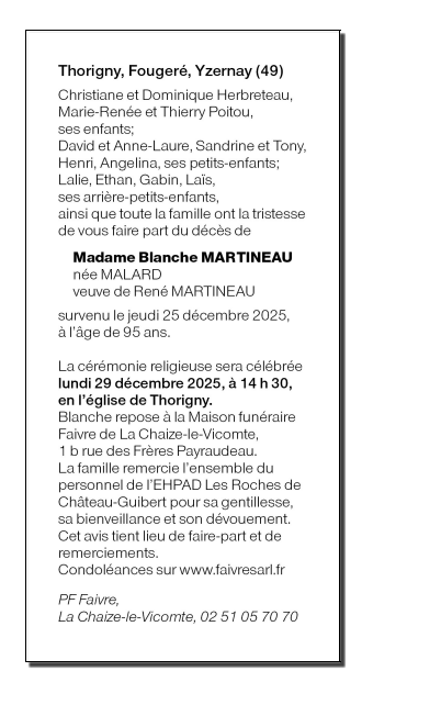 Fallecida en Château-Guibert (85320, Francia) el jueves, 25 de diciembre de 2025 a la edad de 95 años