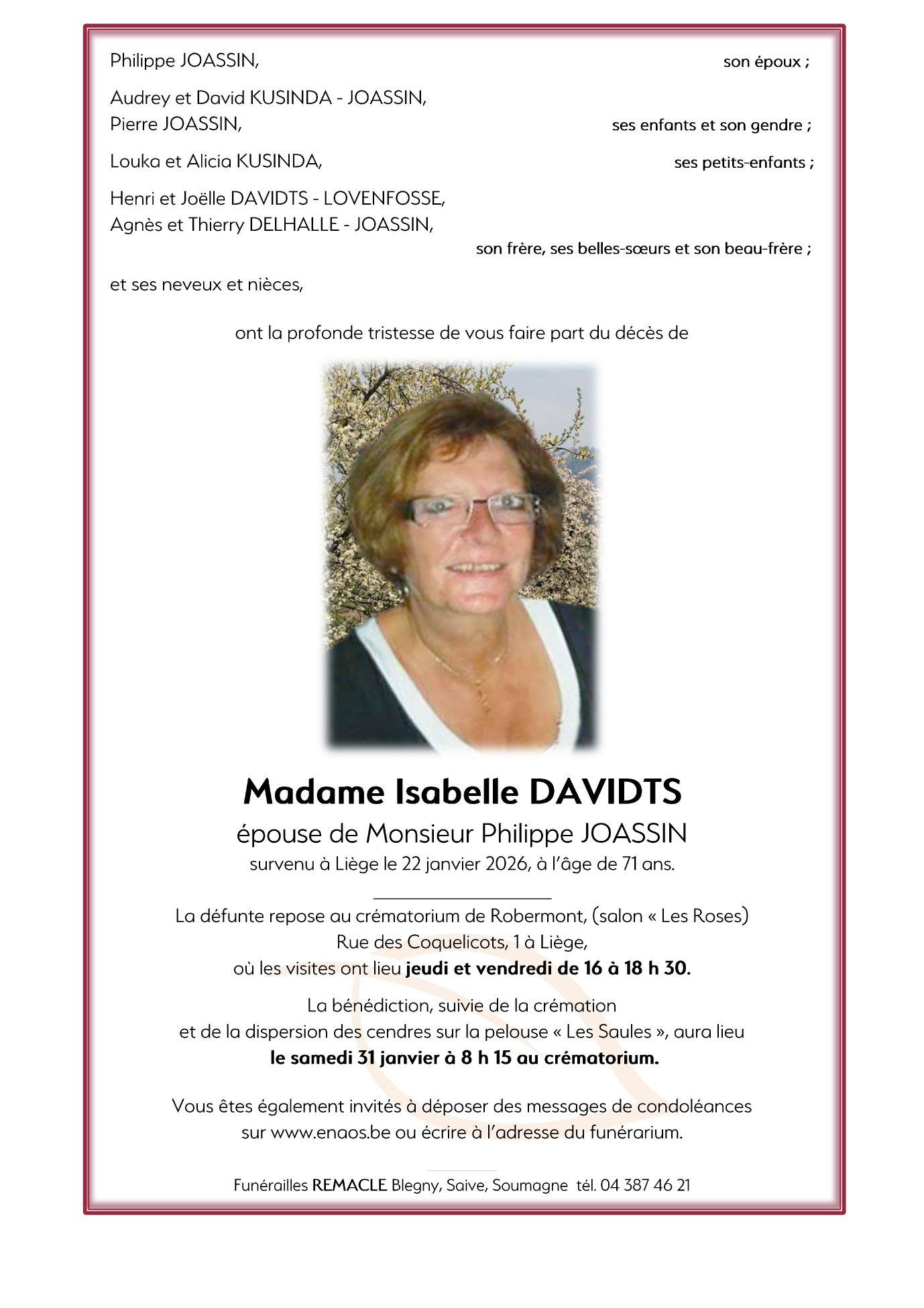 Fallecida en Liège (4031, Bélgica) el viernes, 23 de enero de 2026 a la edad de 71 años