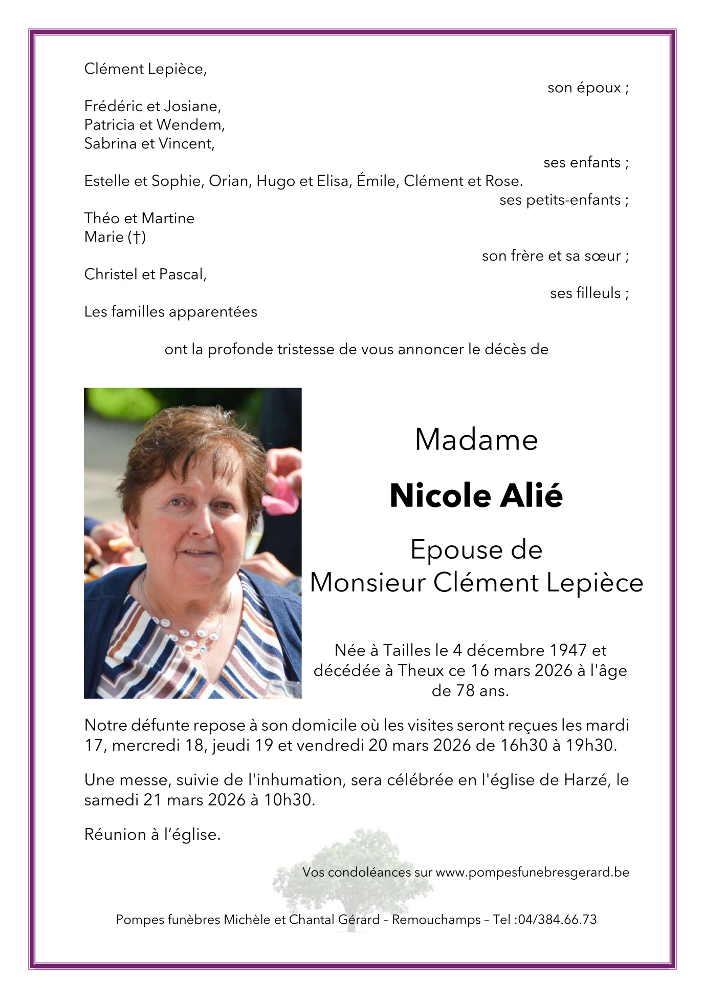 Overleden te Theux (4910, België) op maandag 16 maart 2026 op 78-jarige leeftijd