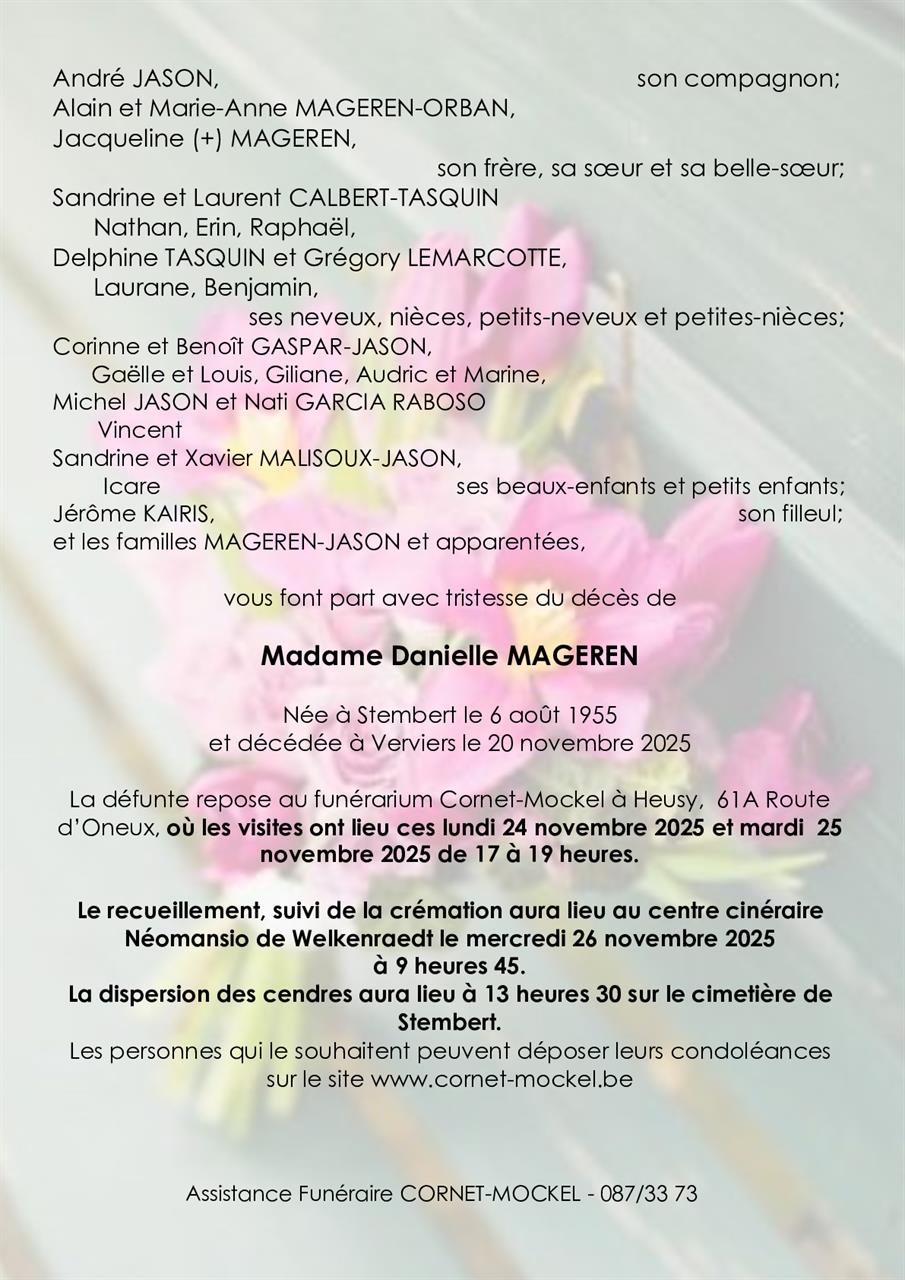 Décédée à Verviers (4800, Belgique) le jeudi 20 novembre 2025 à l'âge de 70 ans