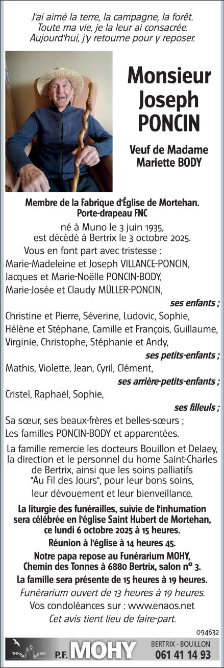 Décédé à Bertrix (6880, Belgique) le vendredi 3 octobre 2025 à l'âge de 90 ans