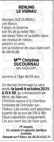 Madame Christine DUCOURNAU née ANGÉLERY