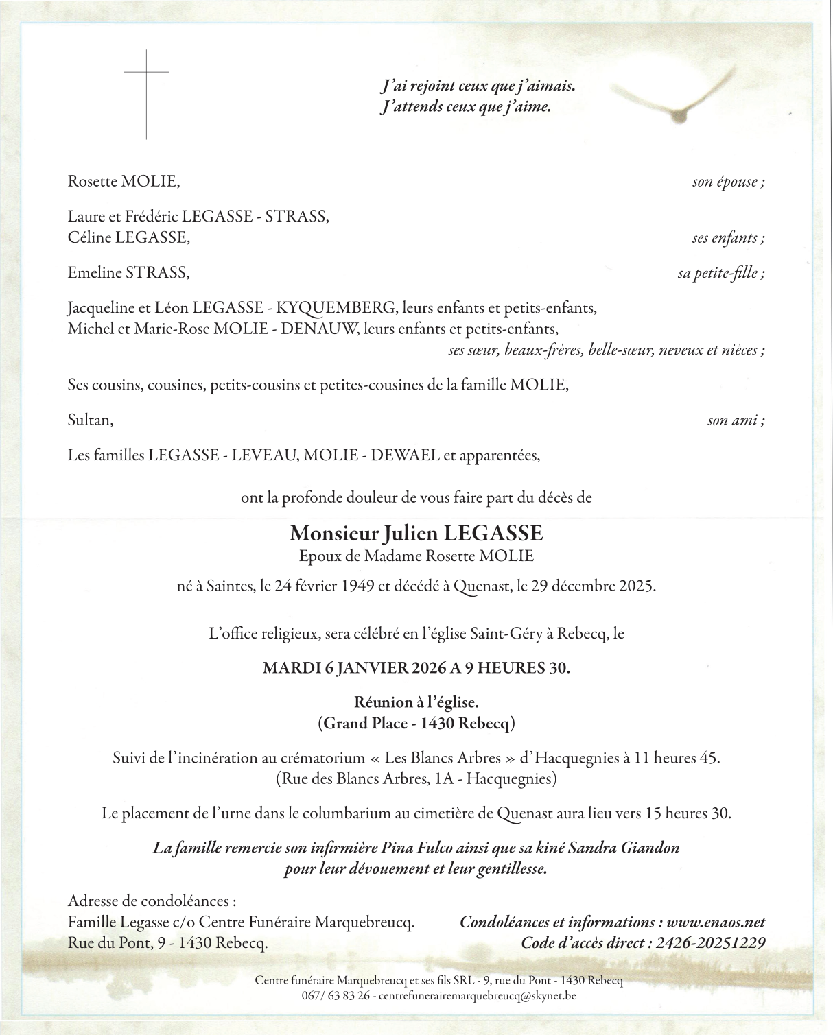 Décédé à Quenast (1430, Belgique) le lundi 29 décembre 2025 à l'âge de 76 ans