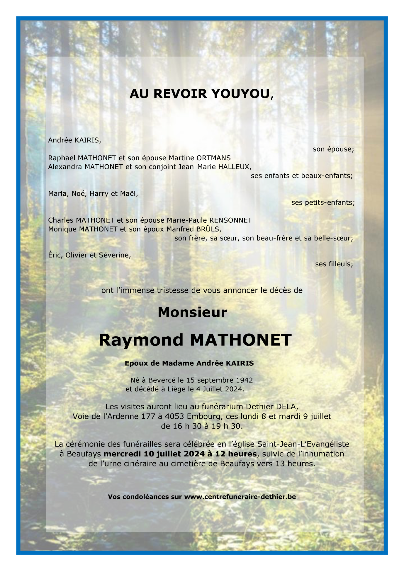 Décédé à Liège (4000, Belgique) le jeudi 4 juillet 2024 à l'âge de 81 ans