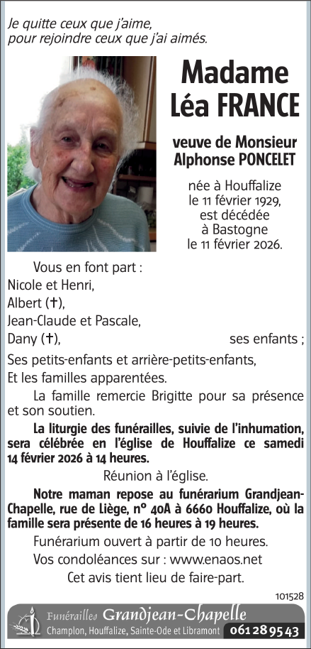 Décédée à Bastogne (6600, Belgique) le mercredi 11 février 2026 à l'âge de 97 ans