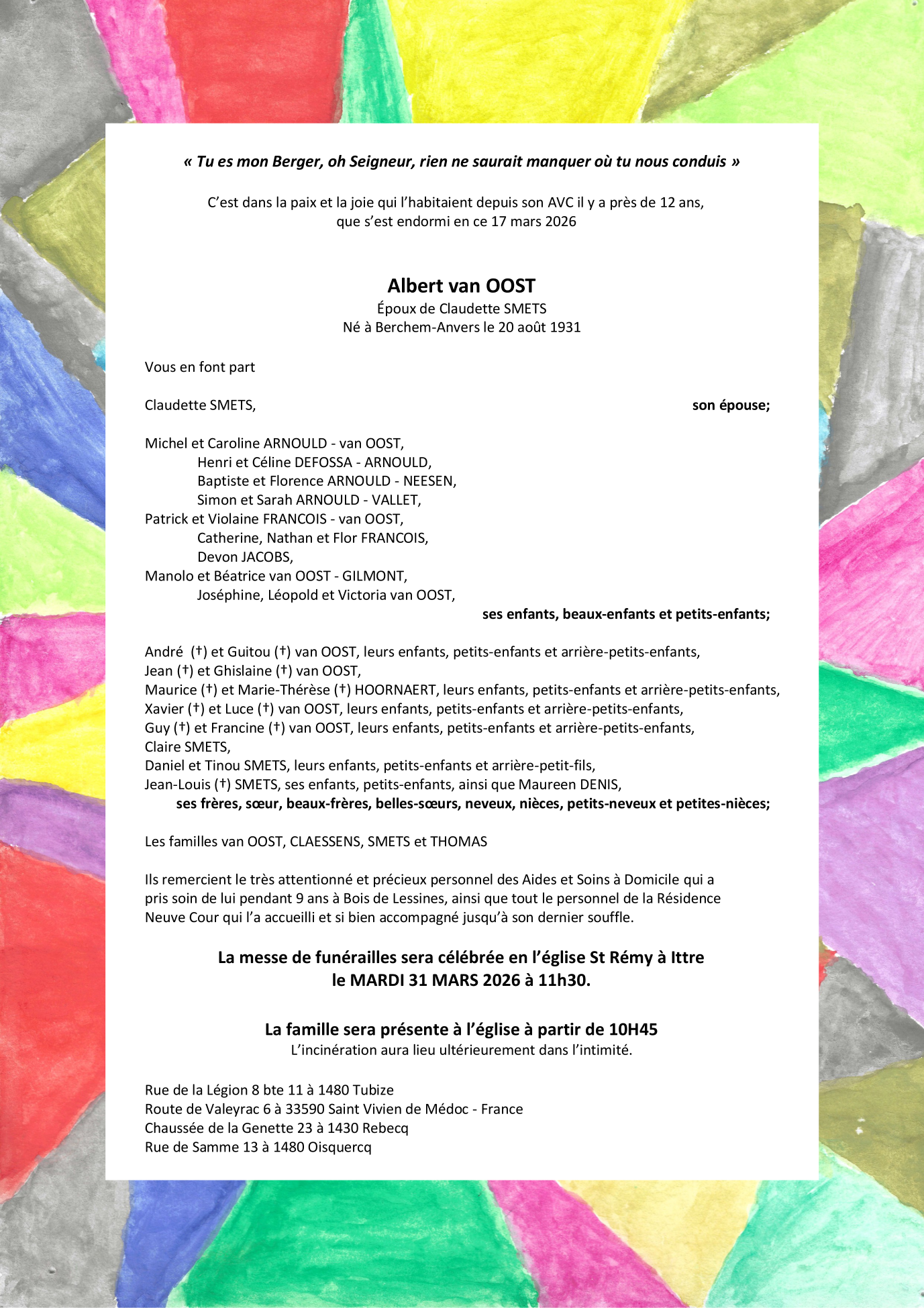 Fallecido en Tubize (1480, Bélgica) el martes, 17 de marzo de 2026 a la edad de 94 años