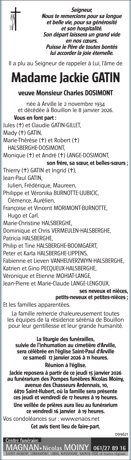 Décédée à Bouillon (6830, Belgique) le lundi 12 janvier 2026 à l'âge de 91 ans