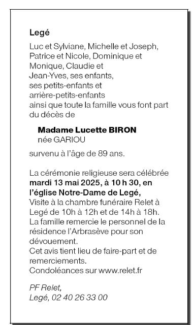 Fallecida en Rocheservière (85620, Francia) el sábado, 10 de mayo de 2025 a la edad de 89 años