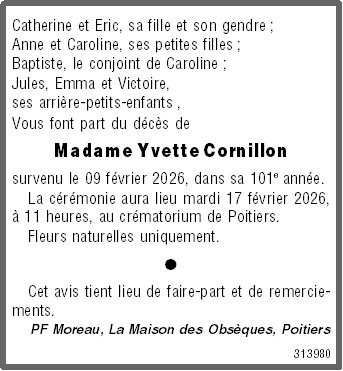 Fallecida en Poitiers (86000, Francia) el lunes, 9 de febrero de 2026 a la edad de 100 años