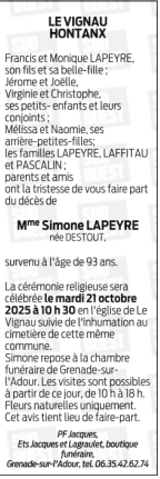 Overleden te Grenade-sur-l'Adour (40270, Frankrijk) op dinsdag 14 oktober 2025 op 93-jarige leeftijd