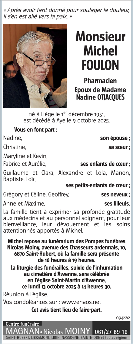 Décédé à Aye (6900, Belgique) le jeudi 9 octobre 2025 à l'âge de 73 ans