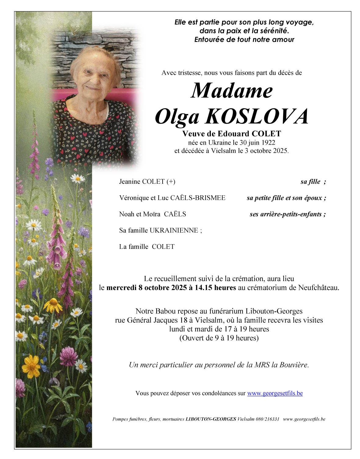 Décédée à Vielsalm (6690, Belgique) le vendredi 3 octobre 2025 à l'âge de 103 ans