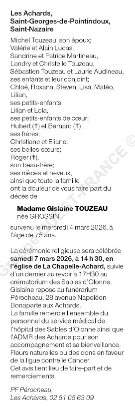 Décédée à Les Sables d'Olonne (85100, France) le mercredi 4 mars 2026 à l'âge de 75 ans