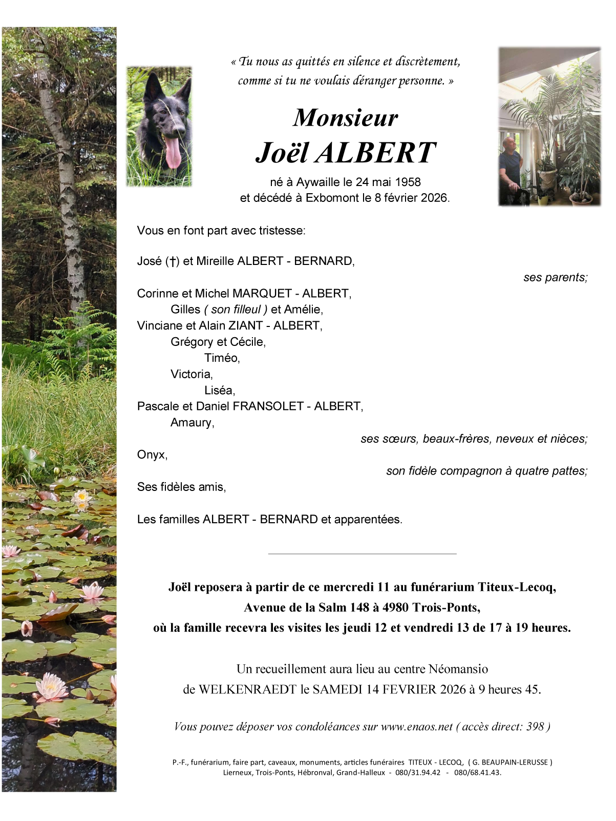 Fallecido en Exbomont (4987, Bélgica) el domingo, 8 de febrero de 2026 a la edad de 67 años