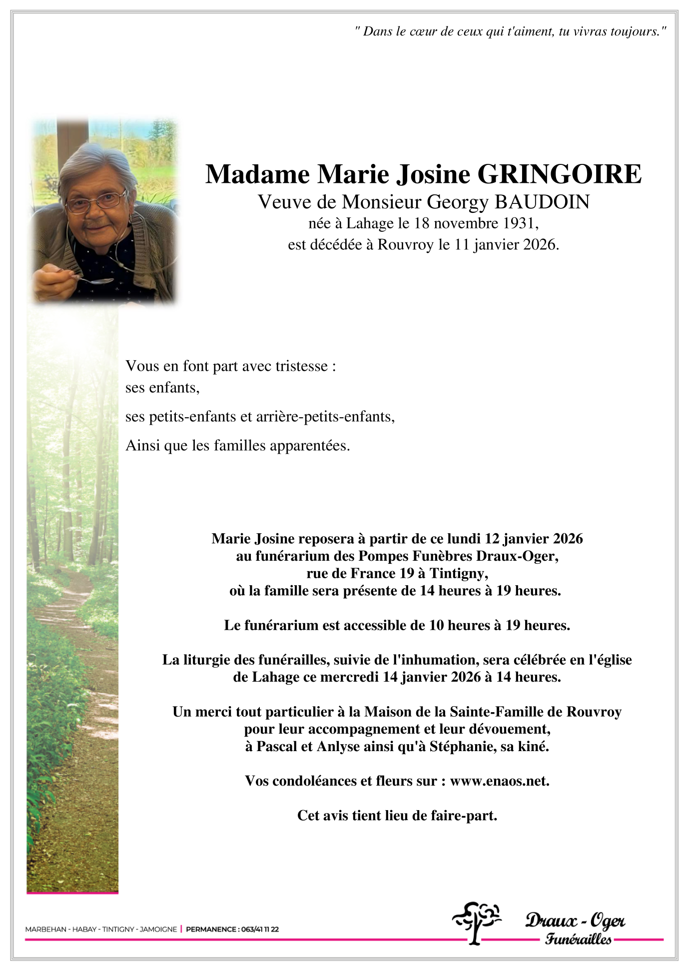 Fallecida en Rouvroy (6767, Bélgica) el domingo, 11 de enero de 2026 a la edad de 94 años