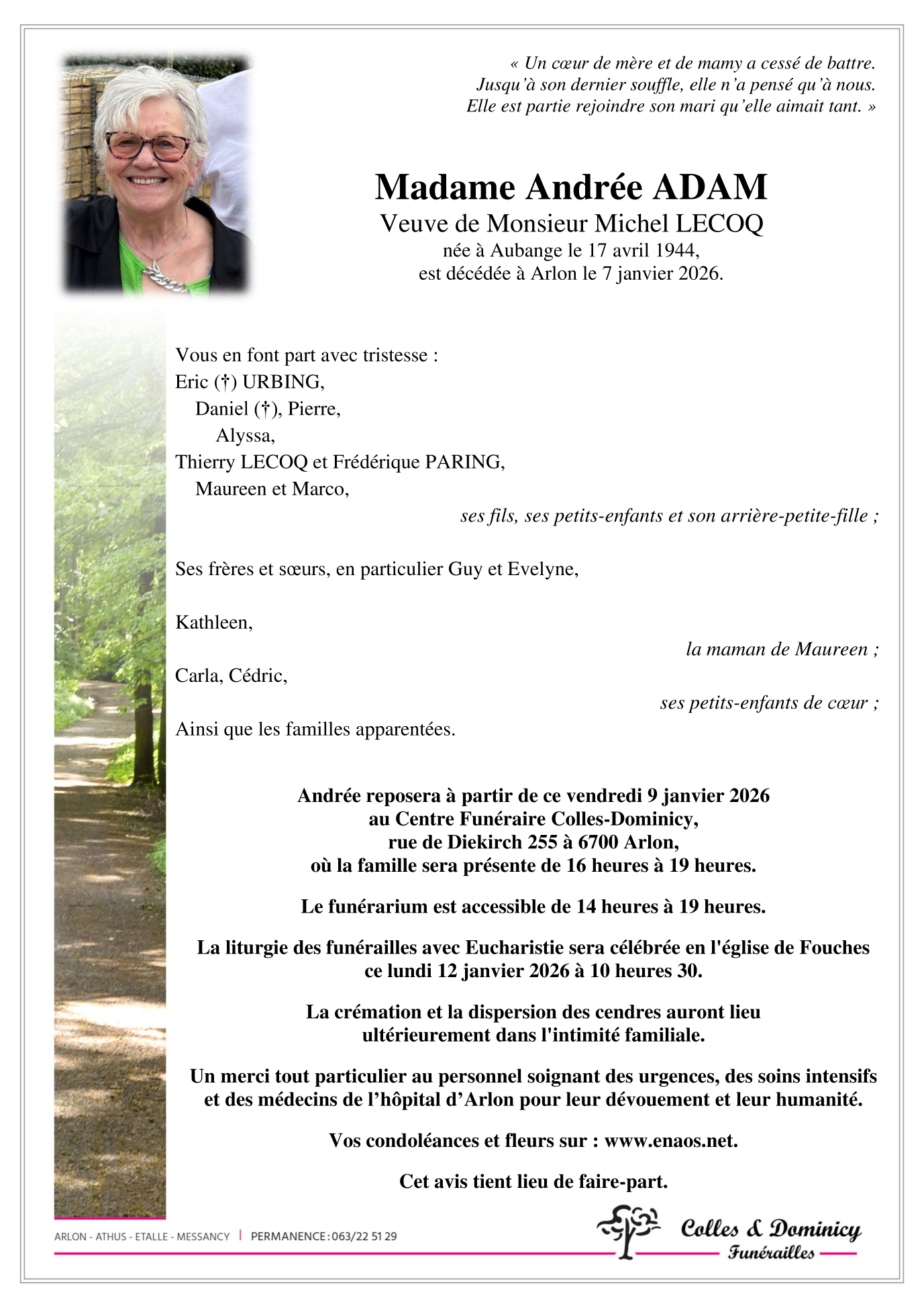 Décédée à Arlon (6700, Belgique) le mercredi 7 janvier 2026 à l'âge de 81 ans
