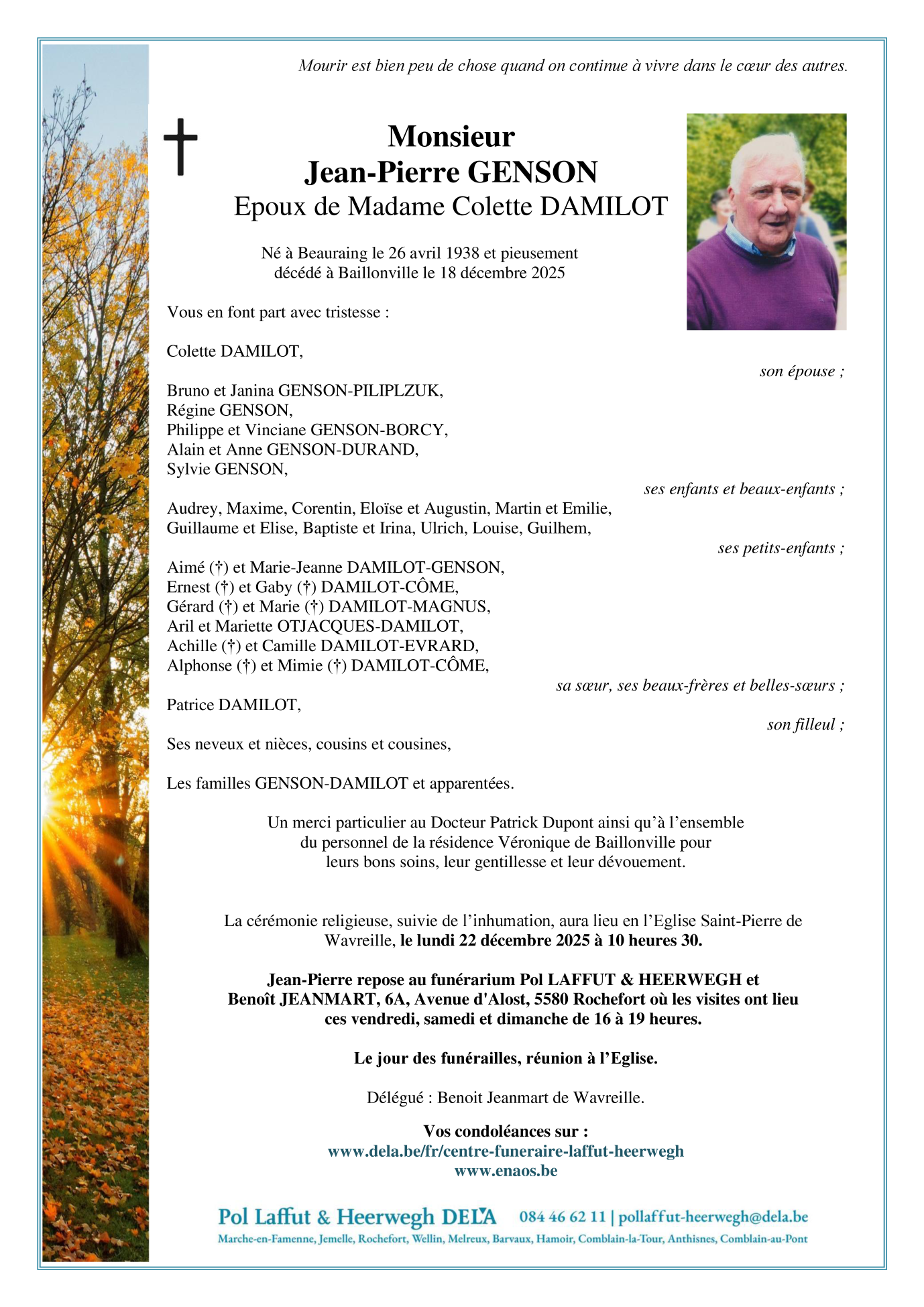 Fallecido en Baillonville (5377, Bélgica) el jueves, 18 de diciembre de 2025 a la edad de 87 años