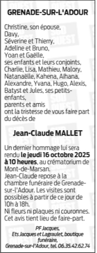 Overleden te Grenade-sur-l'Adour (40270, Frankrijk) op vrijdag 10 oktober 2025 op 76-jarige leeftijd