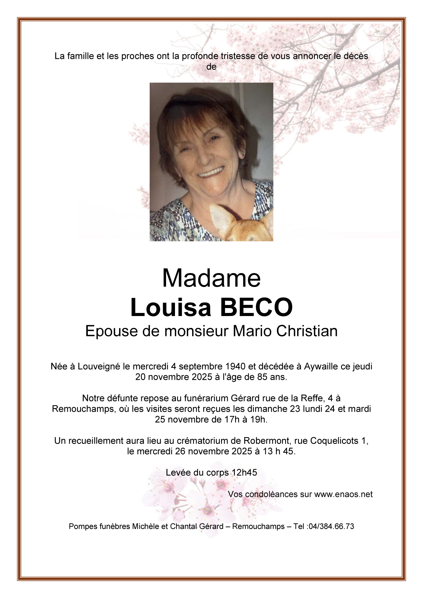 Fallecida en Aywaille (4920, Bélgica) el jueves, 20 de noviembre de 2025 a la edad de 85 años