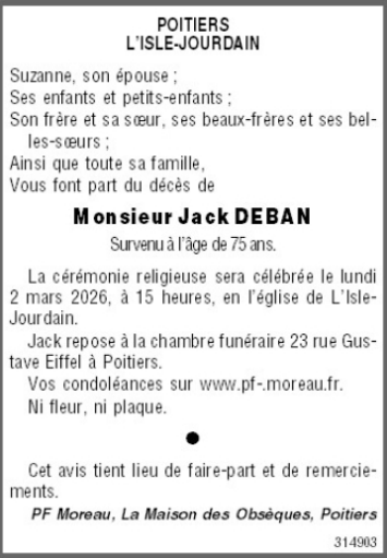 Décédé à Poitiers (86000, France) le jeudi 26 février 2026 à l'âge de 75 ans