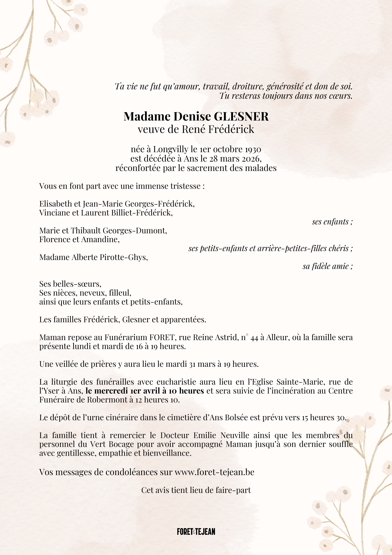 Décédée à Loncin (4431, Belgique) le samedi 28 mars 2026 à l'âge de 95 ans