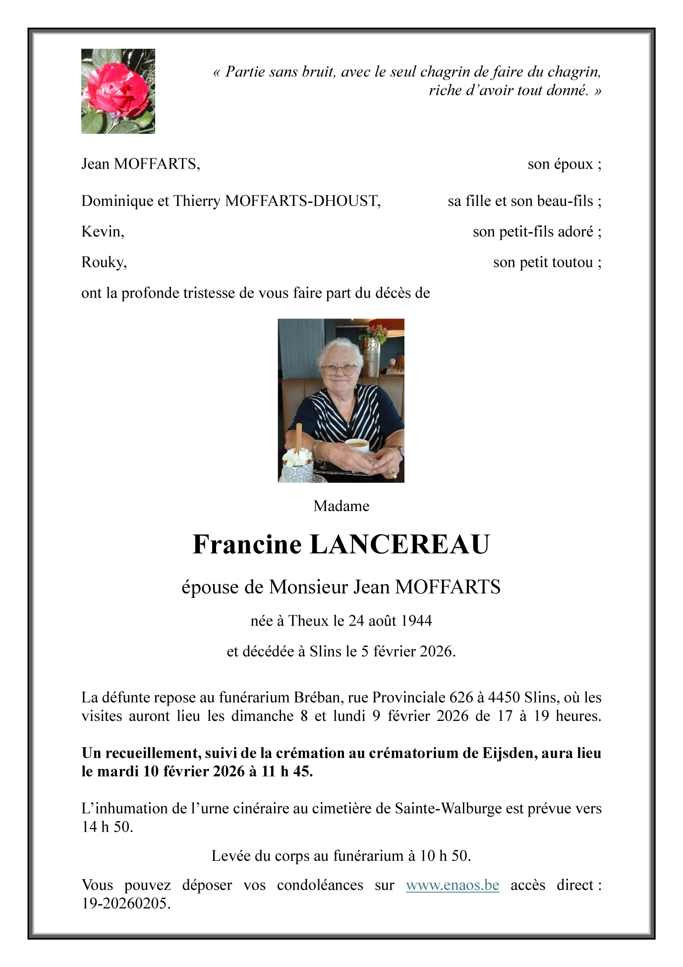 Fallecida en Slins (4450, Bélgica) el jueves, 5 de febrero de 2026 a la edad de 81 años