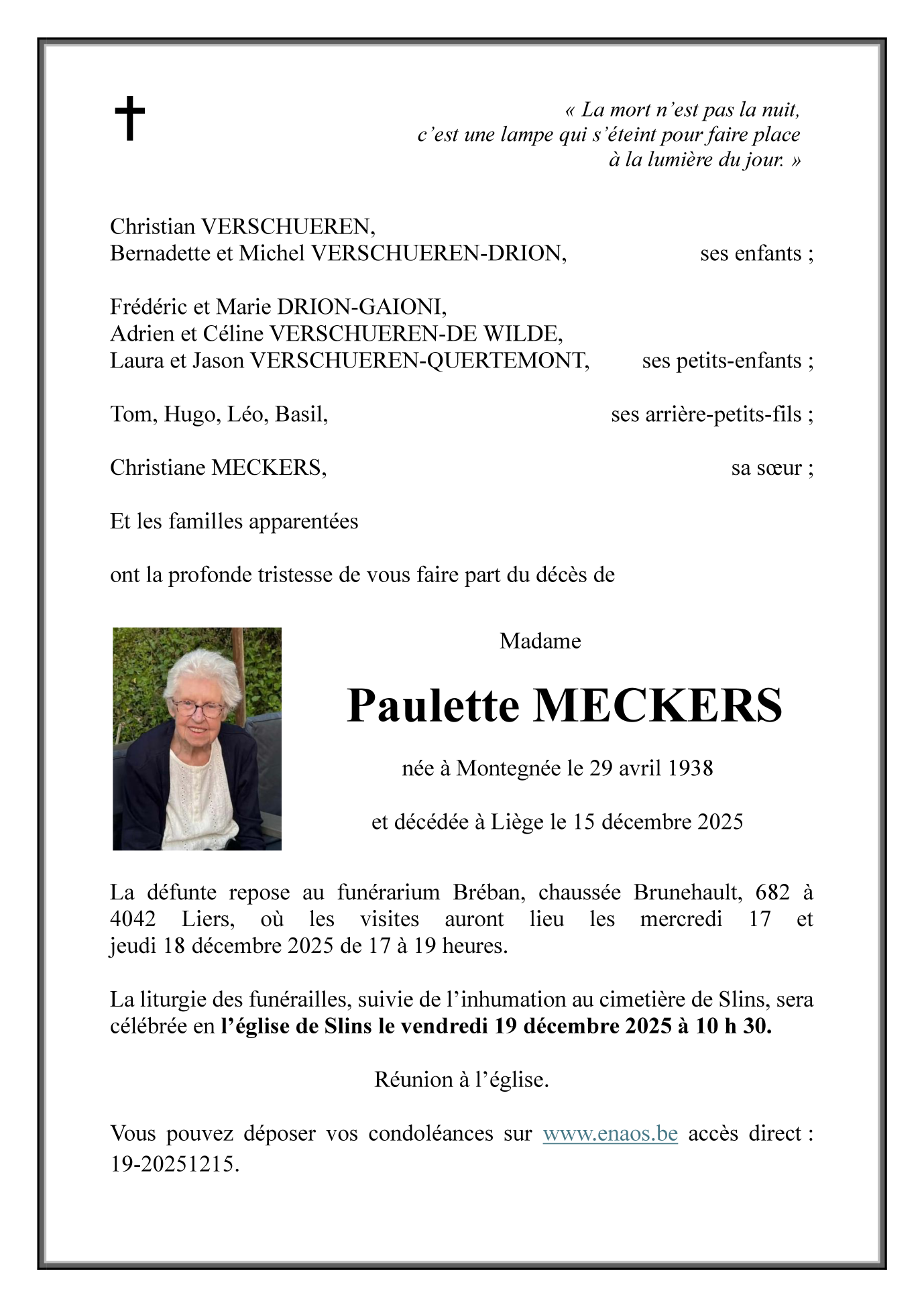 Fallecida en Liège (4000, Bélgica) el lunes, 15 de diciembre de 2025 a la edad de 87 años