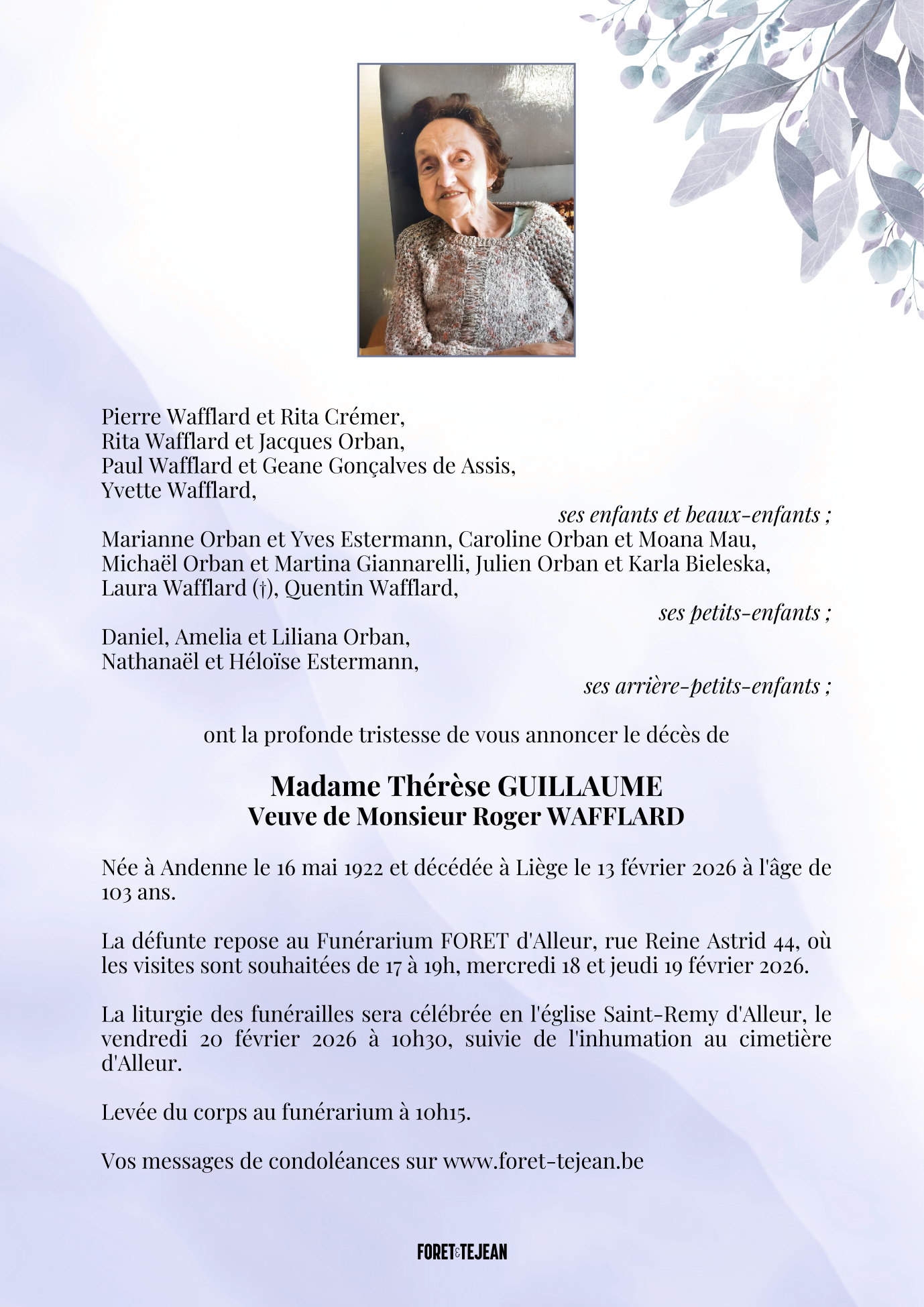 Overleden te Liège (4000, België) op vrijdag 13 februari 2026 op 103-jarige leeftijd
