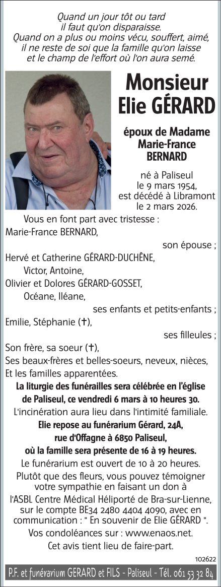 Fallecido en Libramont (6800, Bélgica) el lunes, 2 de marzo de 2026 a la edad de 71 años