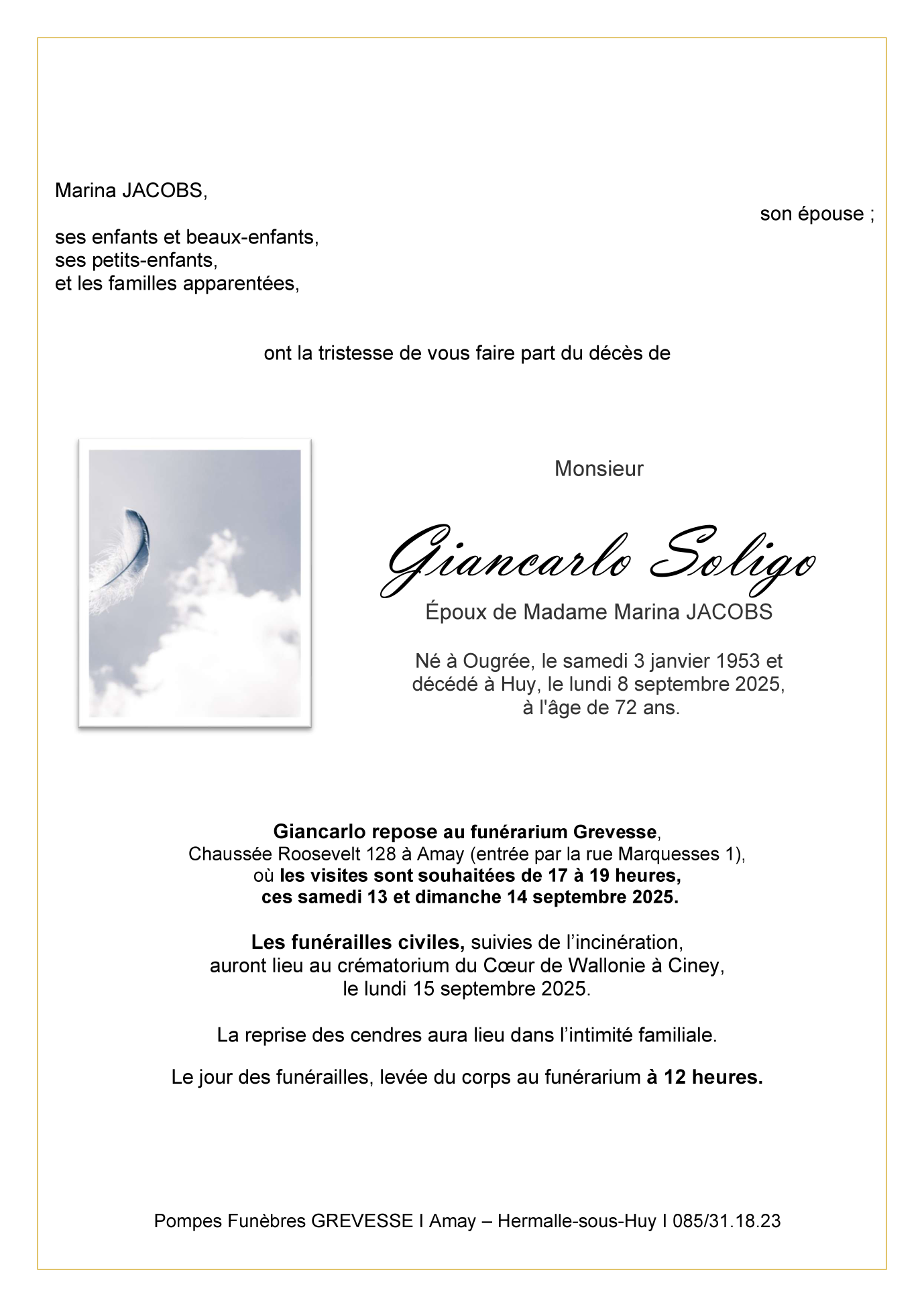 Décédé à Huy (4500, Belgique) le lundi 8 septembre 2025 à l'âge de 72 ans