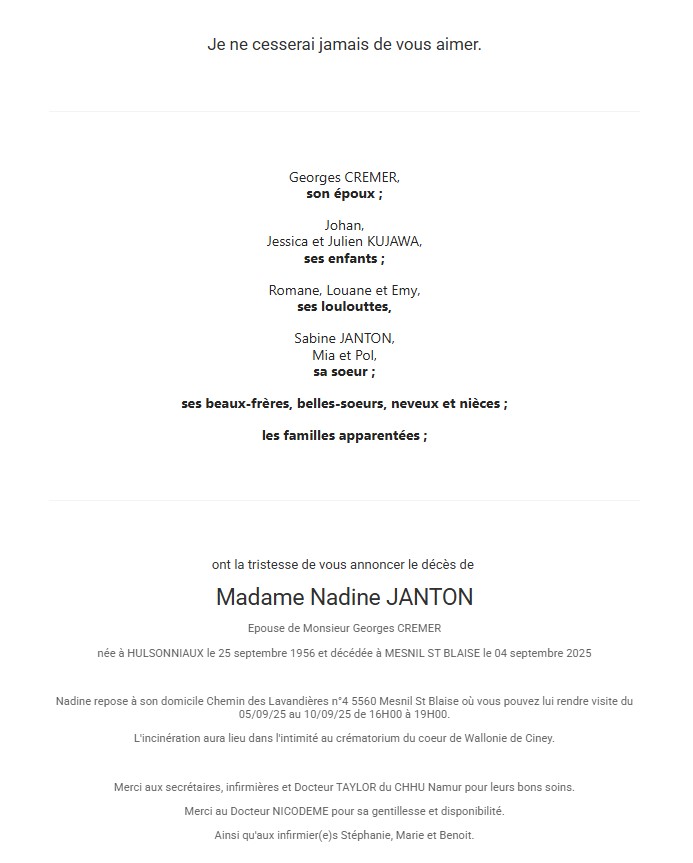 Fallecida en Mesnil-Saint-Blaise (5560, Bélgica) el jueves, 4 de septiembre de 2025 a la edad de 68 años
