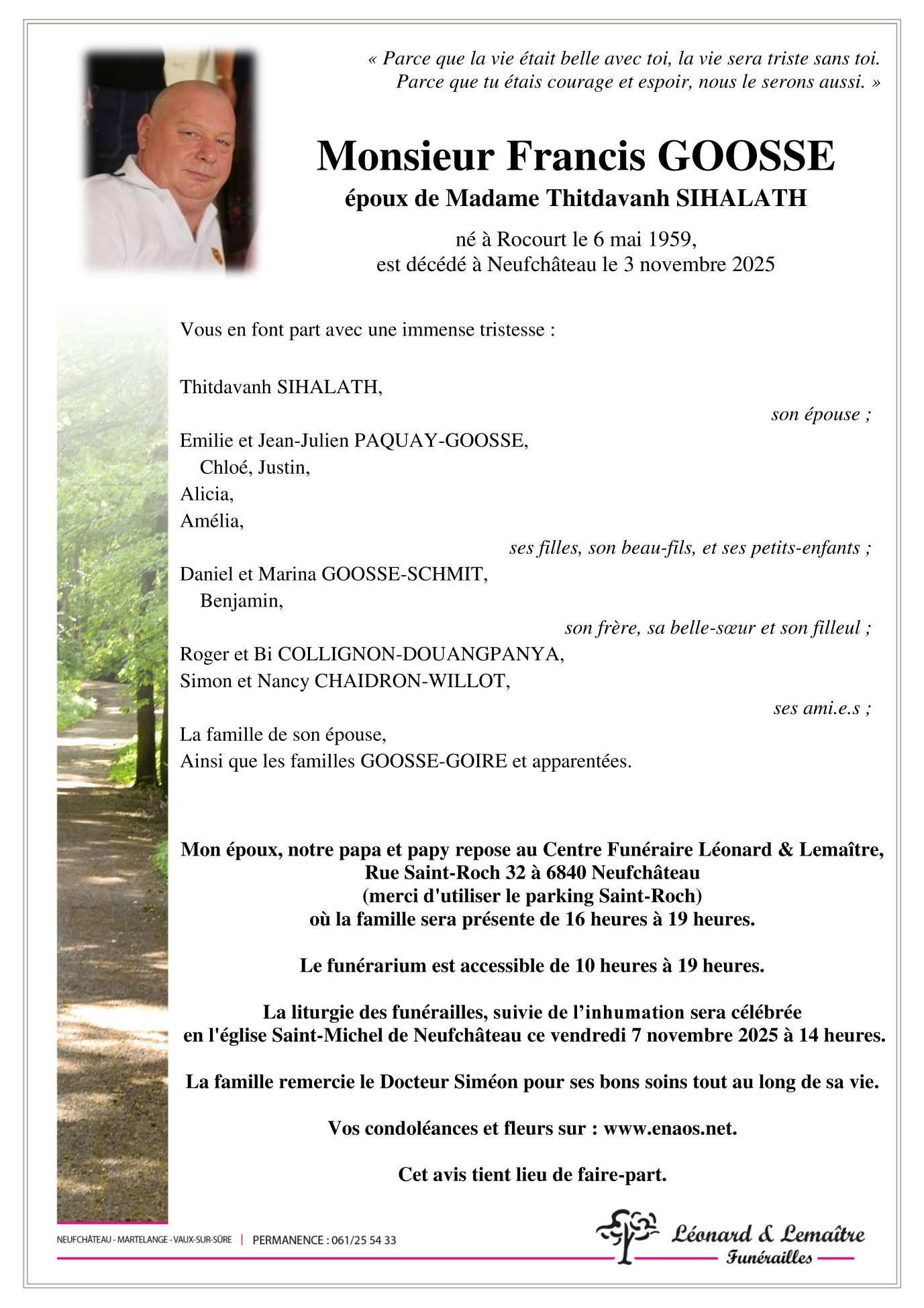 Décédé à Neufchâteau (6840, Belgique) le lundi 3 novembre 2025 à l'âge de 66 ans