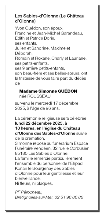 Fallecida en Les Sables d'Olonne (85100, Francia) el miércoles, 17 de diciembre de 2025 a la edad de 96 años