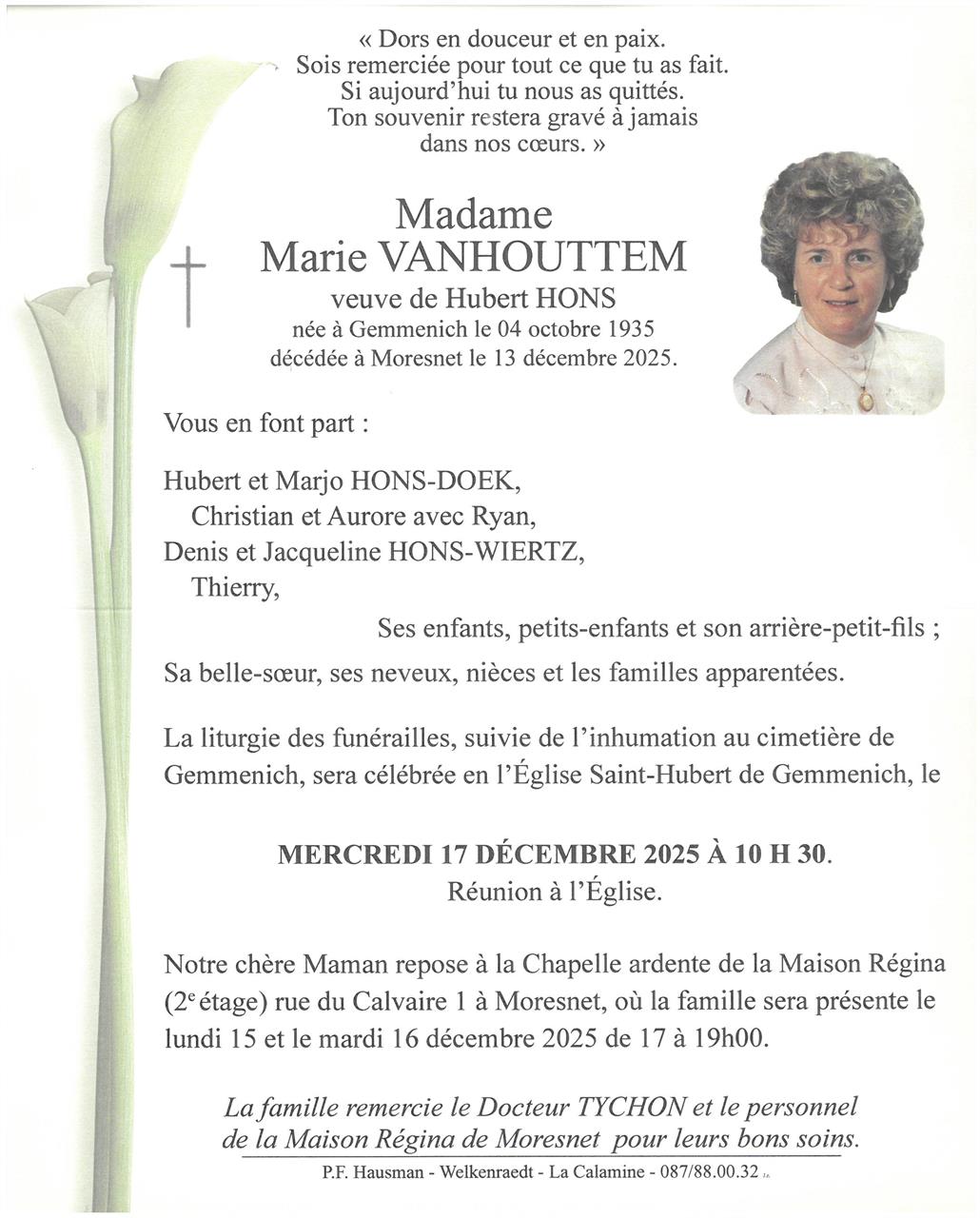 Fallecida en Moresnet (4850, Bélgica) el sábado, 13 de diciembre de 2025 a la edad de 90 años