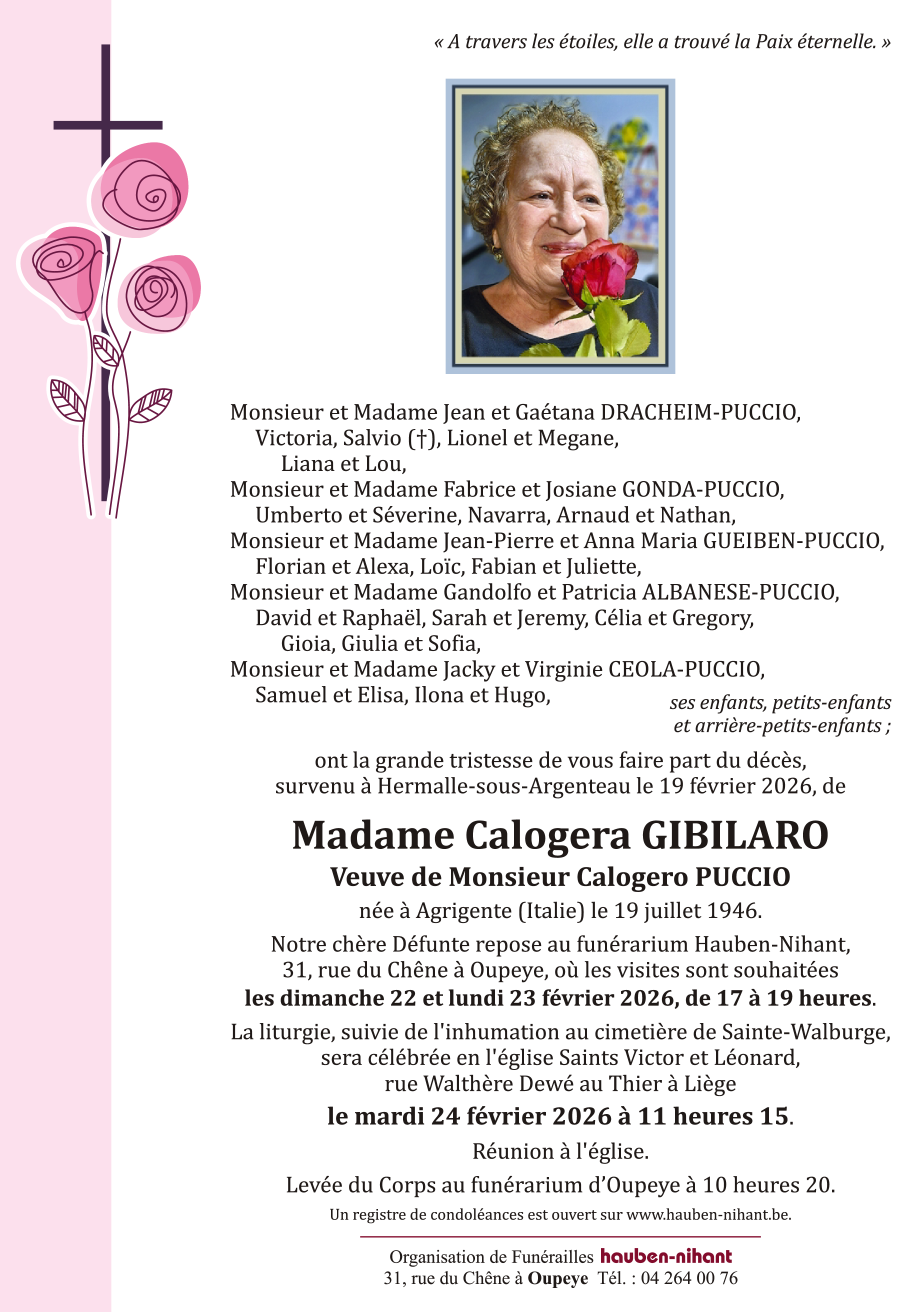 Fallecida en Hermalle-sous-Argenteau (4681, Bélgica) el jueves, 19 de febrero de 2026 a la edad de 79 años