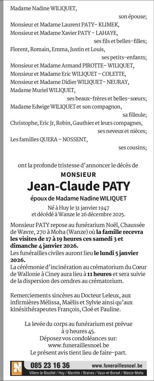 Décédé à Wanze (4520, Belgique) le vendredi 26 décembre 2025 à l'âge de 78 ans