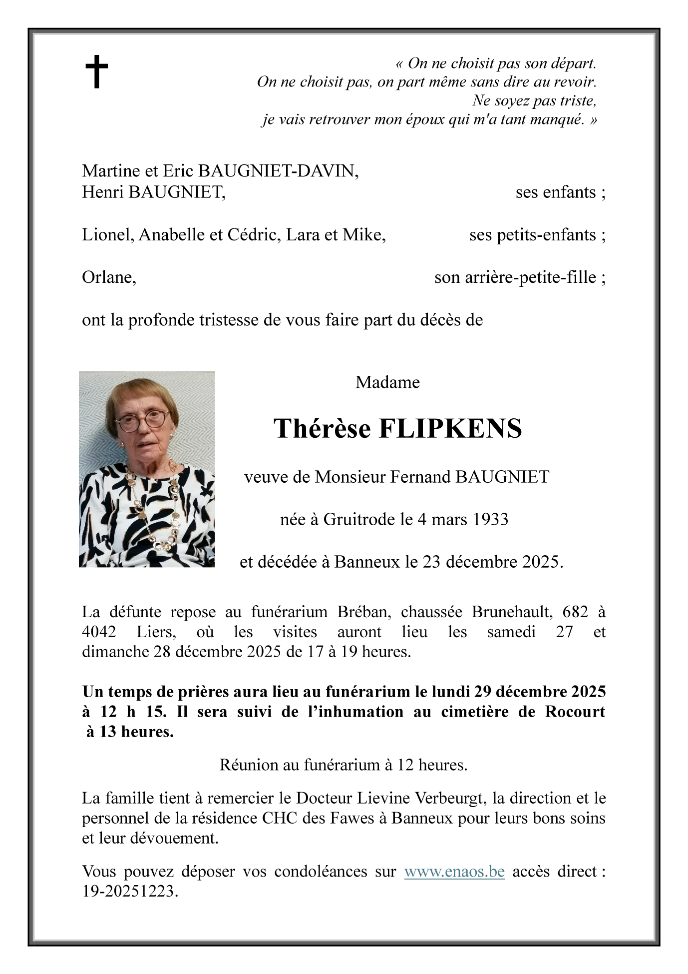 Madame Thérèse FLIPKENS veuve de Fernand BAUGNIET